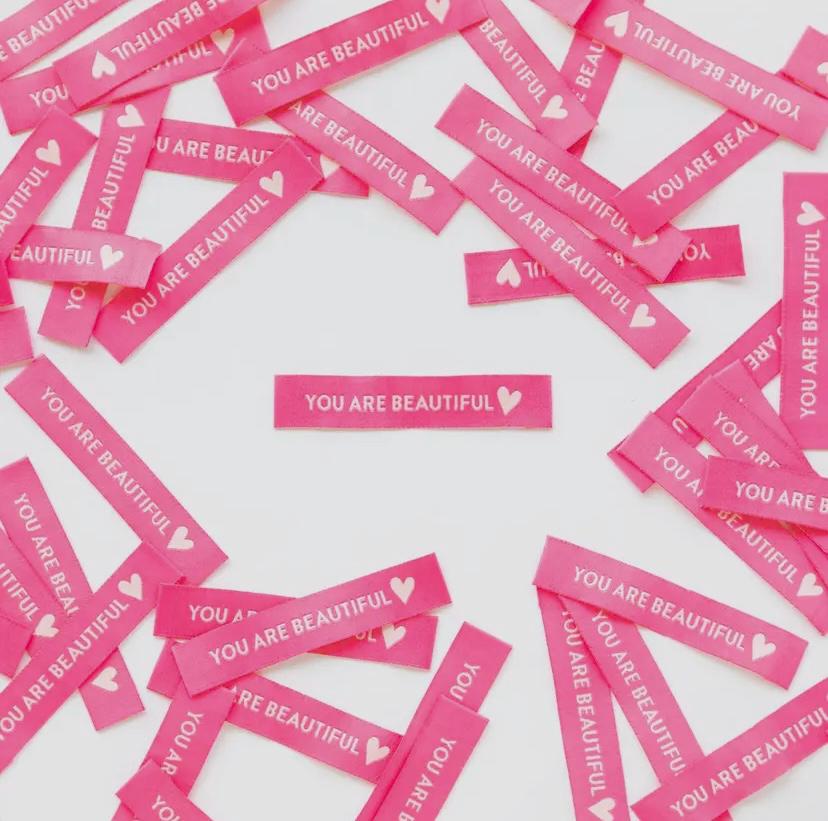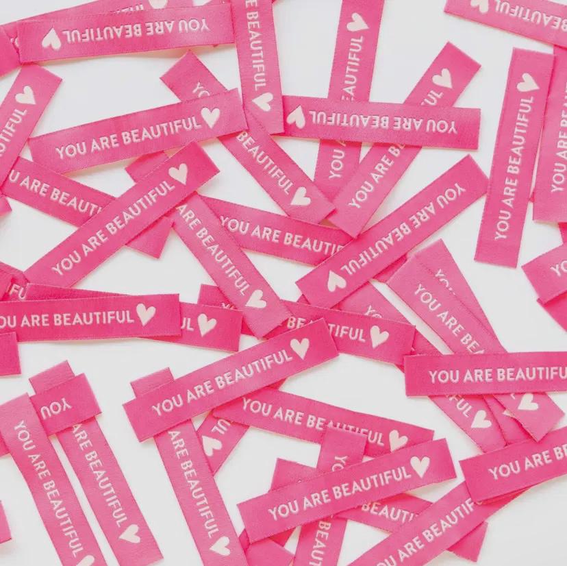The woven labels are fully washable and can handle the heat of the dryer. The labels perfectly match the strawberry pinks in the Sarah Hearts fabric collection.
